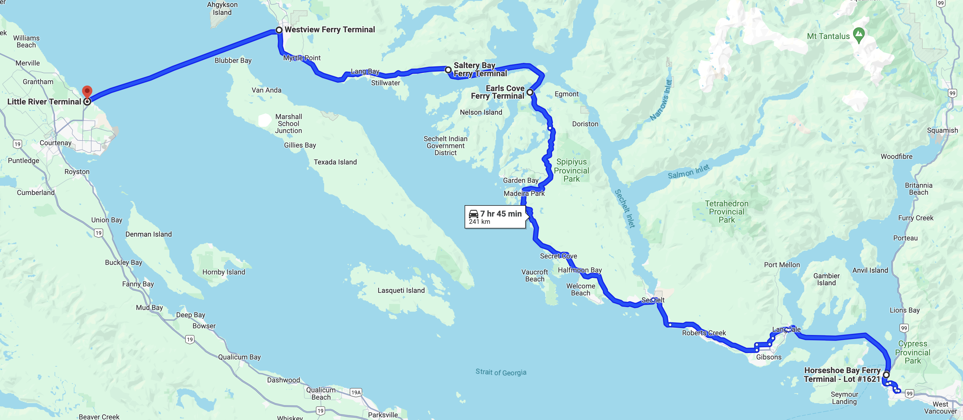 Little River, Comox on Vancouver Island, is a 90 minute ferry ride that is 16.7 nautical miles from the Westview Ferry Terminal, Powell River. Island residents would also have the option to drive 118 km, or about 1.5 hours to reach the Nanaimo, Departure Bay Ferry Terminal, where a 100 minute ferry ride that is 32.3 nautical miles from the Island terminal would deliver them to Horseshoe Bay, West Vancouver. BC Ferries offers 4 returns trips per day.